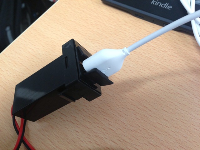 フロントカメラを車に取り付けましたが、その時についでにUSB機器を充電するのに使える電源端子も付けておきました。